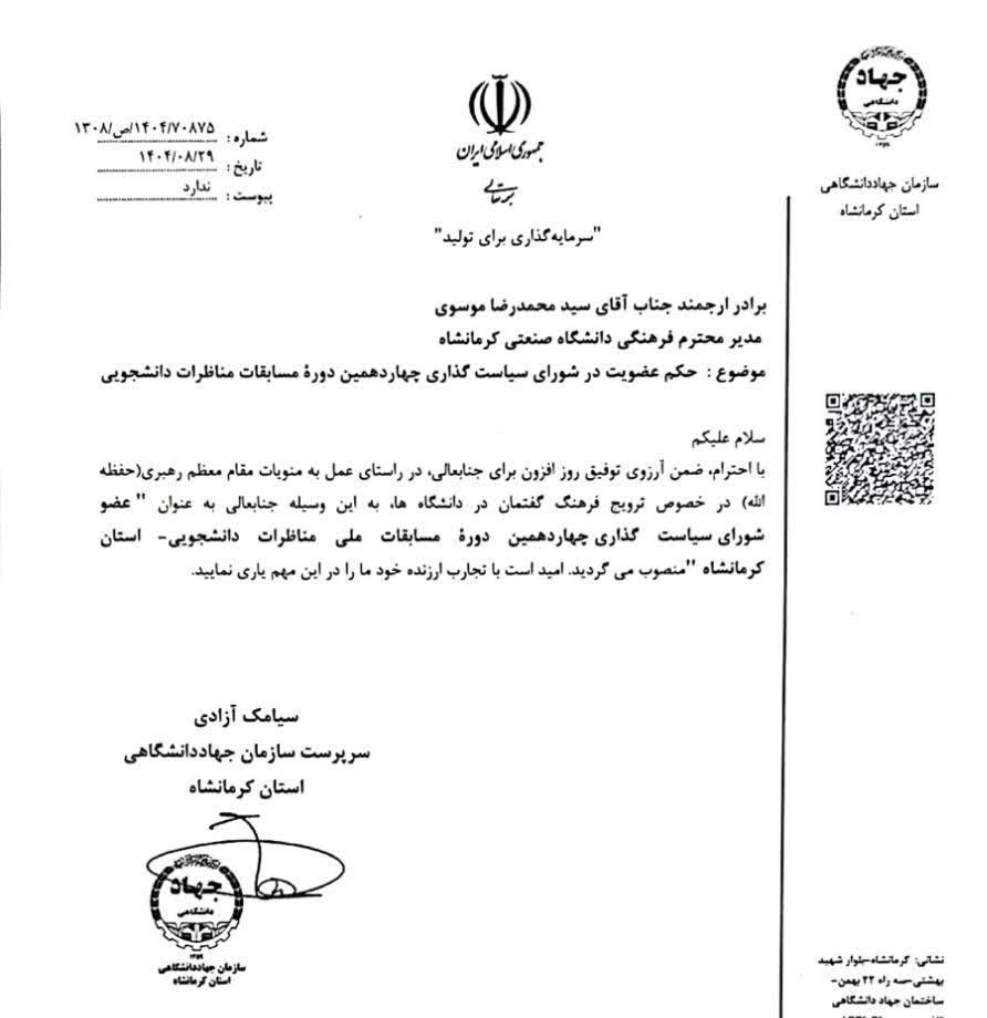 انتصاب اعضای شورای سیاستگذاری چهاردهمین دوره مسابقات مناظرات دانشجویی در کرمانشاه