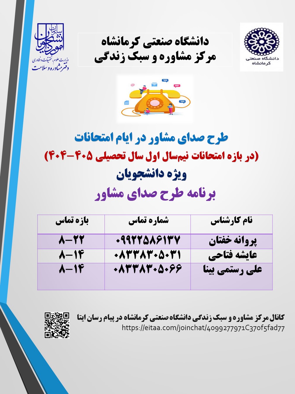 مشاوره تلفنی در ایام امتحانات ویژه دانشجویان مکان مرکز مشاوره و سبک زندگی: ساختمان مرکزی دانشگاه – طبقه منفی یک (زیر زمین) -اتاق شماره 06 روزهای فعالیت مرکز مشاوره (جهت مراجعه حضوری): شنبه تا چهارشنبه 8 الی 14 دانشگاه صنعتی …